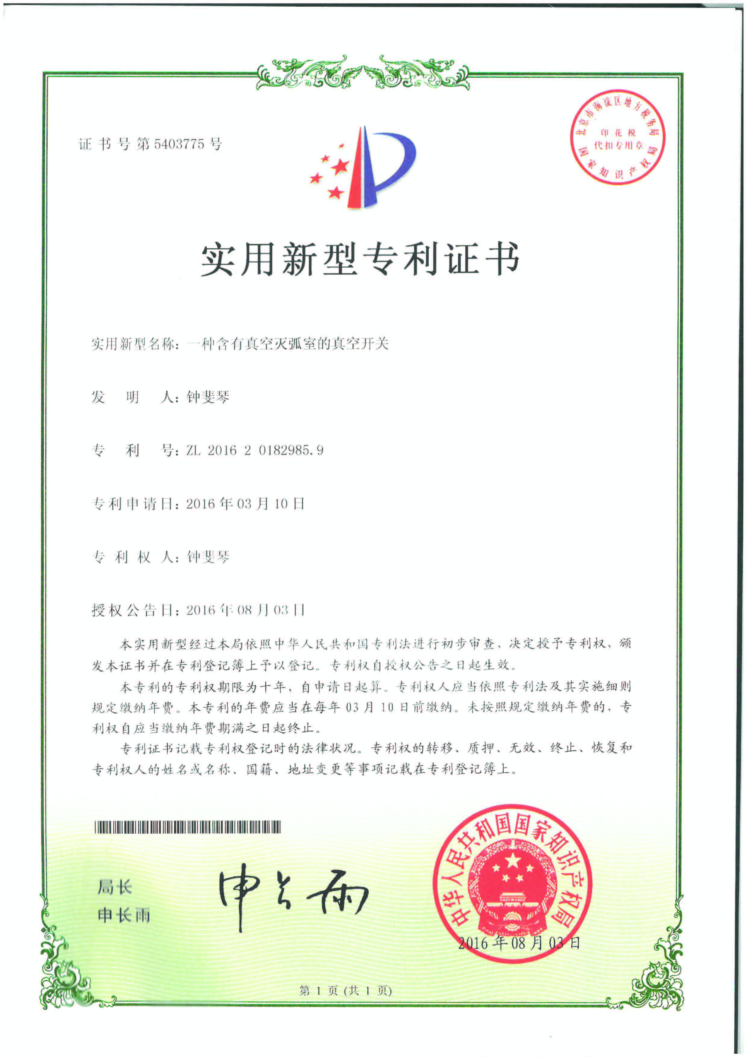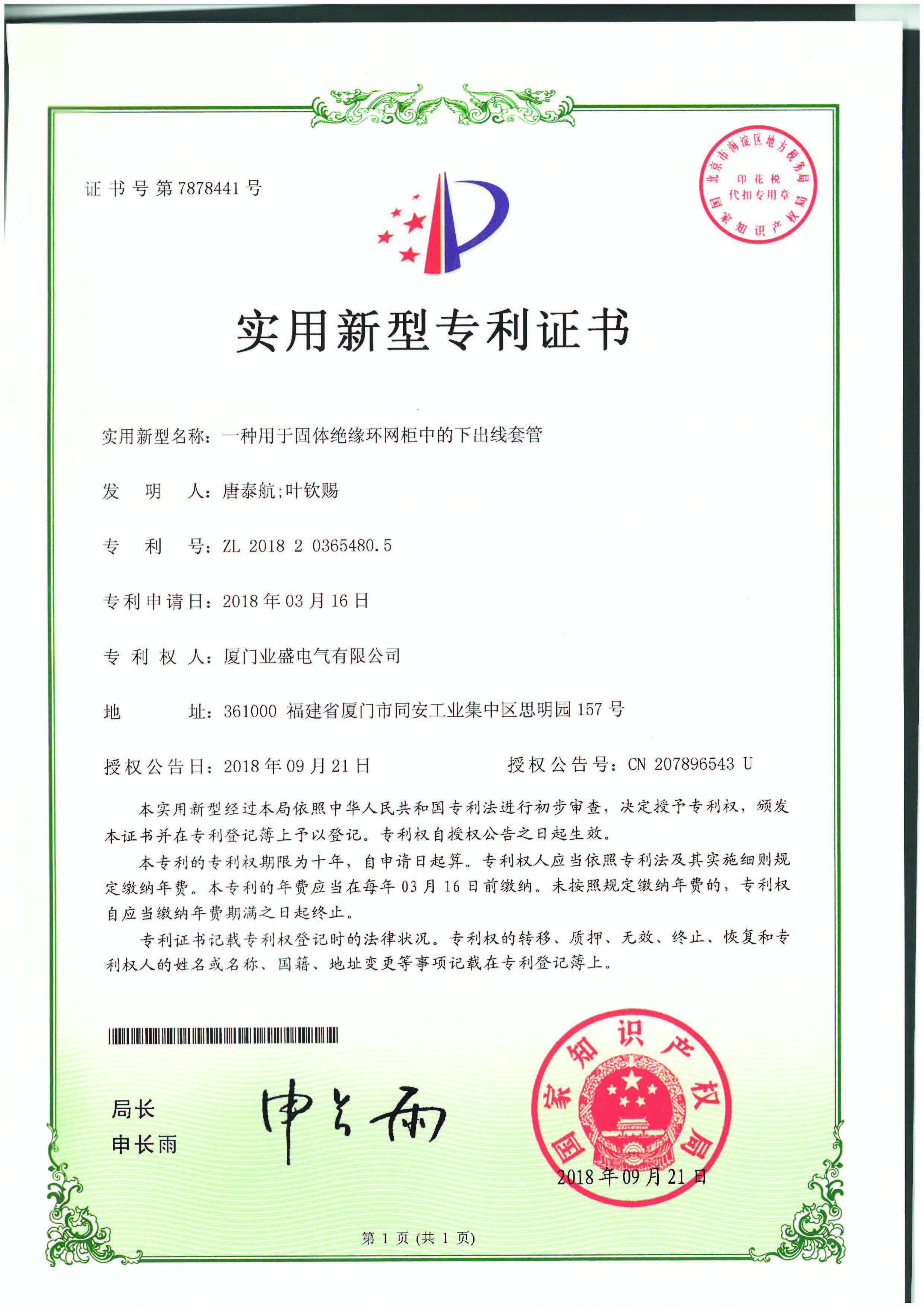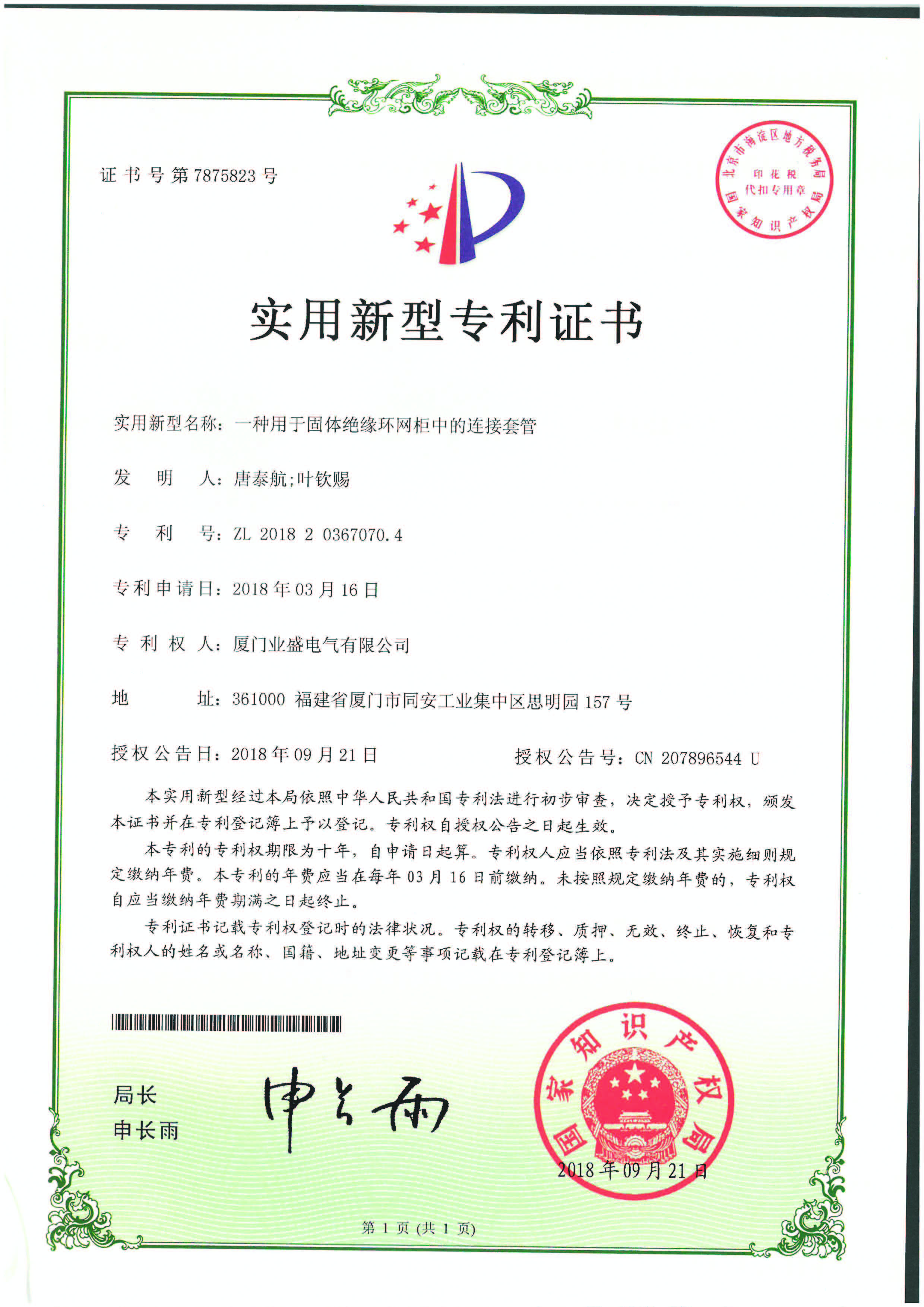 實用新型專利證書